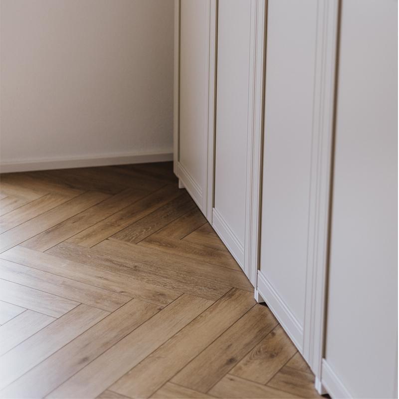 plakplinten in dezelfde kleur als de COREtec Naturals Herringbone vloer.